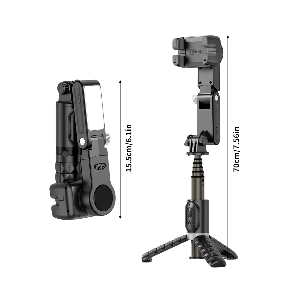 גימבל נייד משולב עם חצובת סלפי, שלט אלחוטי ותאורה נשלפת - מעמד טלפון נייד מתקפל